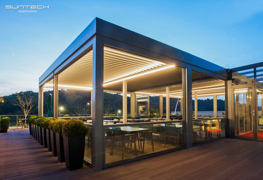Ze względu na swoją funkcjonalność oraz elegancki wygląd pergole z rozsuwanym dachem marki SUNTECH doskonale sprawdzają się nie tylko w warunkach zabudowy mieszkaniowej, ale również w przypadku obiektów użytkowych, takich jak restauracje, hotele czy kawiarnie. System został opracowany w taki sposób, żeby umożliwić adaptację dowolnej przestrzeni zewnętrznej, jednocześnie gwarantując jej funkcjonalność i ponadczasowe wzornictwo.